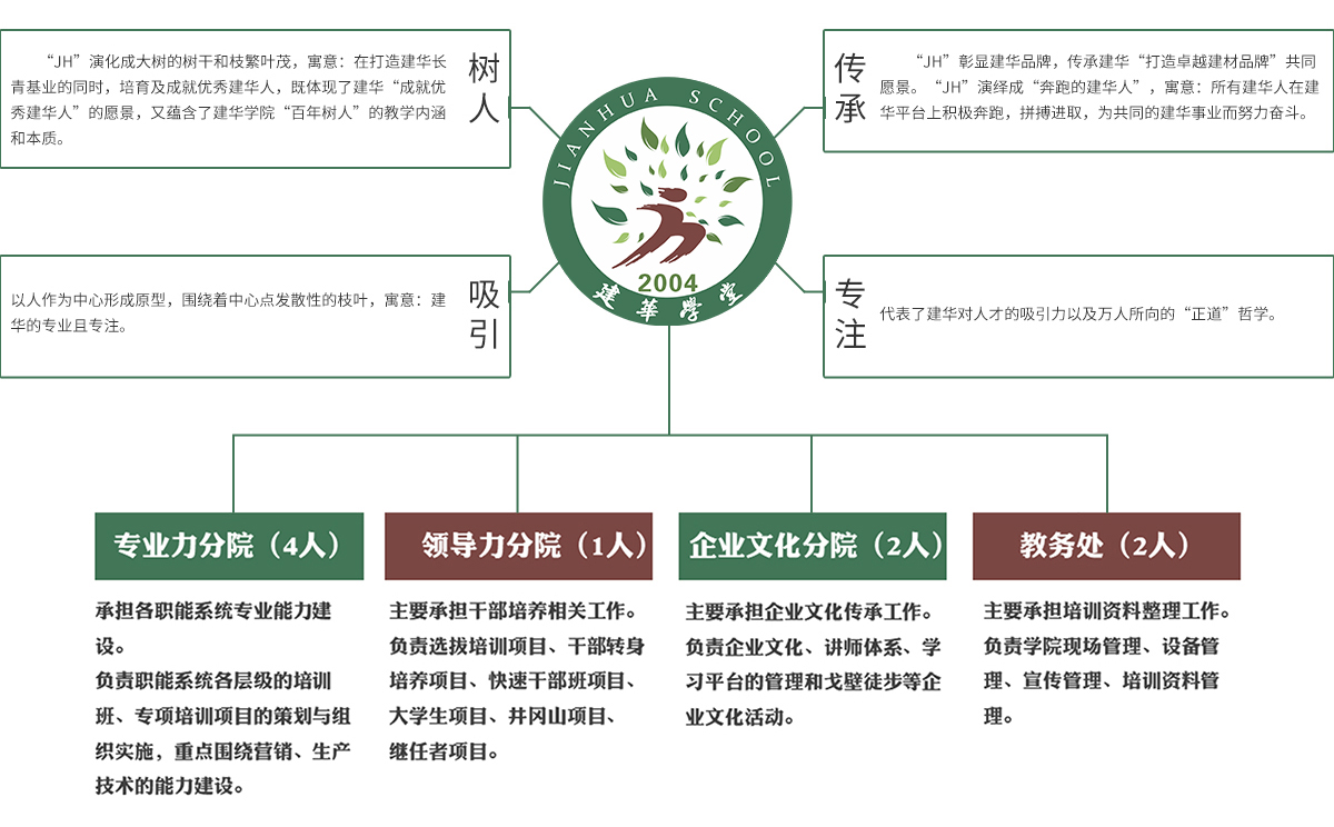 目 的:為了踐行“以人為本”的企業(yè)理念,更好地完善集團公司的人才梯隊建設(shè),以重視人、尊重人、提升人為出發(fā)點,使公司管理人員和專業(yè)技術(shù)人員的能力素質(zhì)能跟上集團快速發(fā)展的要求和步伐,特成立建華學院。建華學院擔負著不斷地提升人、培養(yǎng)人的重要使命!