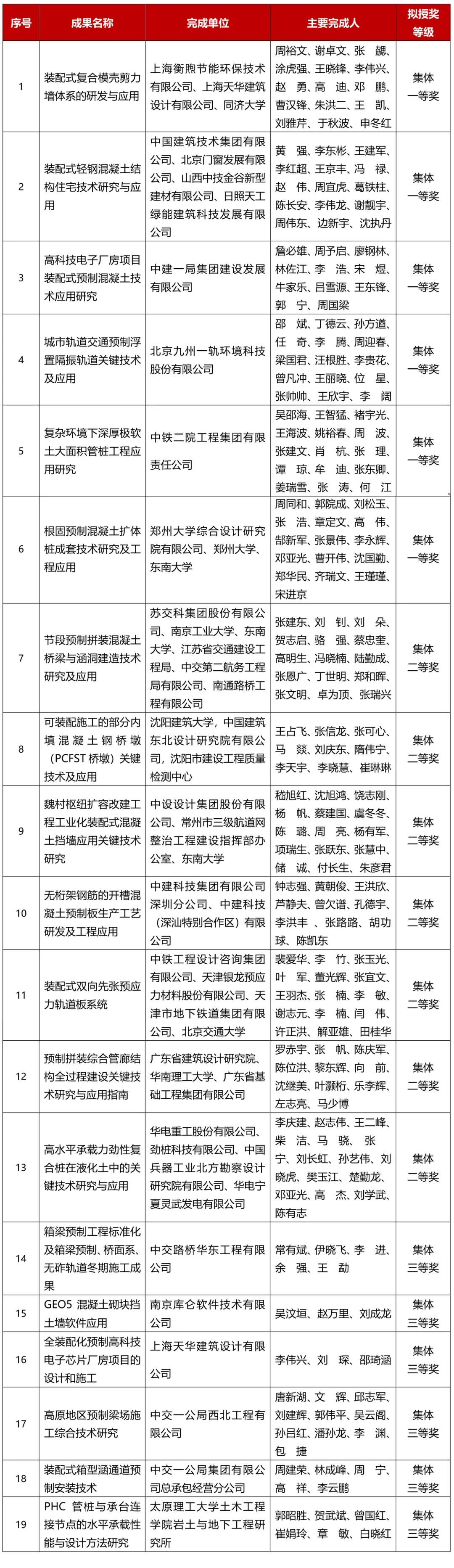2021年度“建華工程獎”共收到有效申報材料68份,根據《“建華工程獎”章程》的要求,經過形式審查、預審、專家評審等程序,擬授予“裝配式復合模殼剪力墻體系的研發(fā)與應用”等6項成果集體一等獎、“節(jié)段預制拼裝混凝土橋梁與涵洞建造技術研究及應用”等7項成果集體二等獎、“箱梁預制工程標準化及箱梁預制、橋面系、無砟軌道冬期施工成果”等6項成果集體三等獎。為了確?!肮_、公正、公平”的原則,現將擬授獎名單予以公示。如有異議,請在公示期內,書面向“建華工程獎”獎勵辦公室提出。以單位名義的,應寫明單位、聯(lián)系人、聯(lián)系電話,并加蓋單位公章;以個人名義的,應署本人真實姓名、工作單位和聯(lián)系電話。
