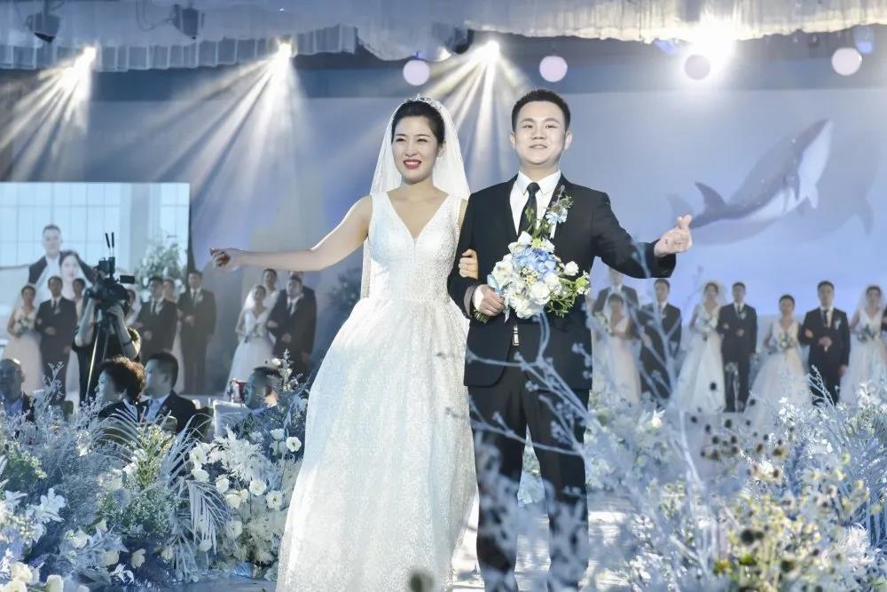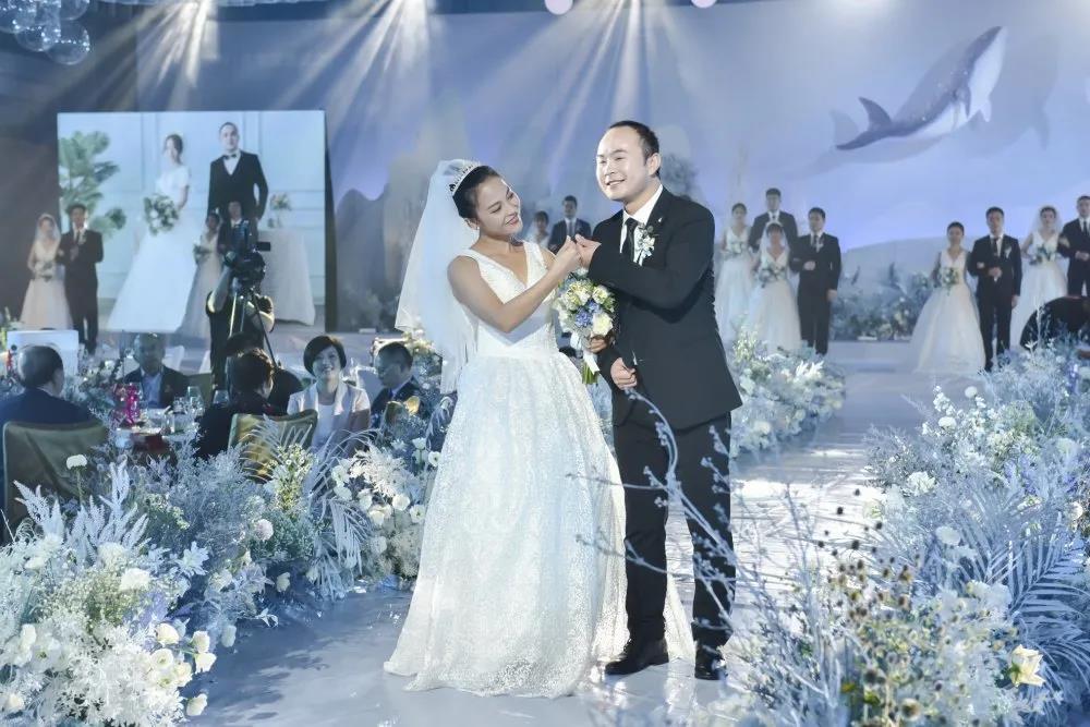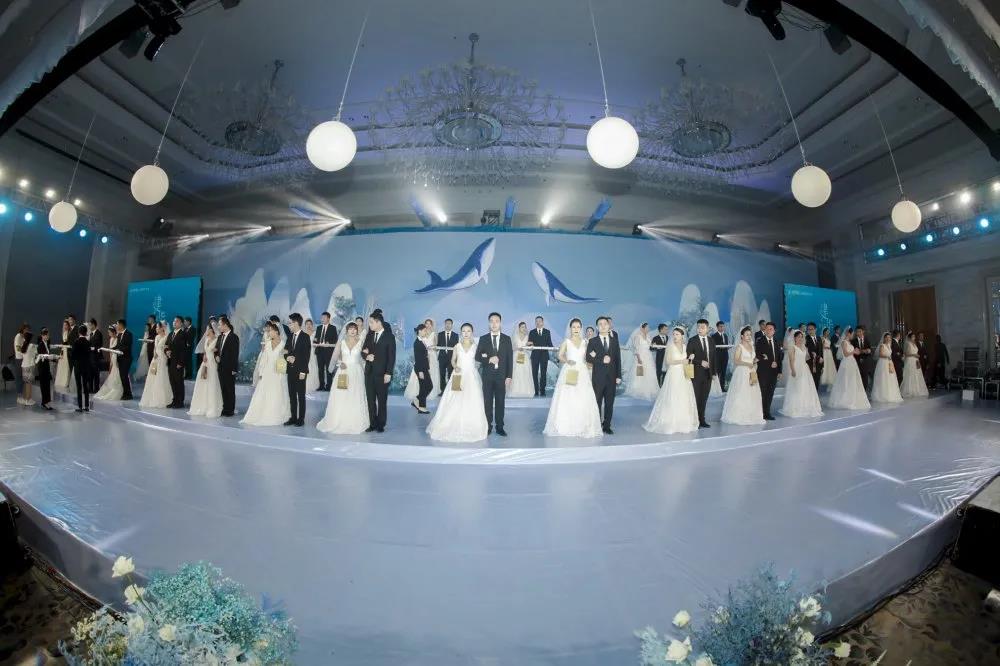 夢境中走出的“海的女兒”拉開夢幻婚禮的序幕,30對新人在“海洋精靈”的引領(lǐng)下依次入場,臉上洋溢著無比幸福的笑容,以默契合拍的舞蹈展示,成為全場焦點。